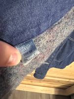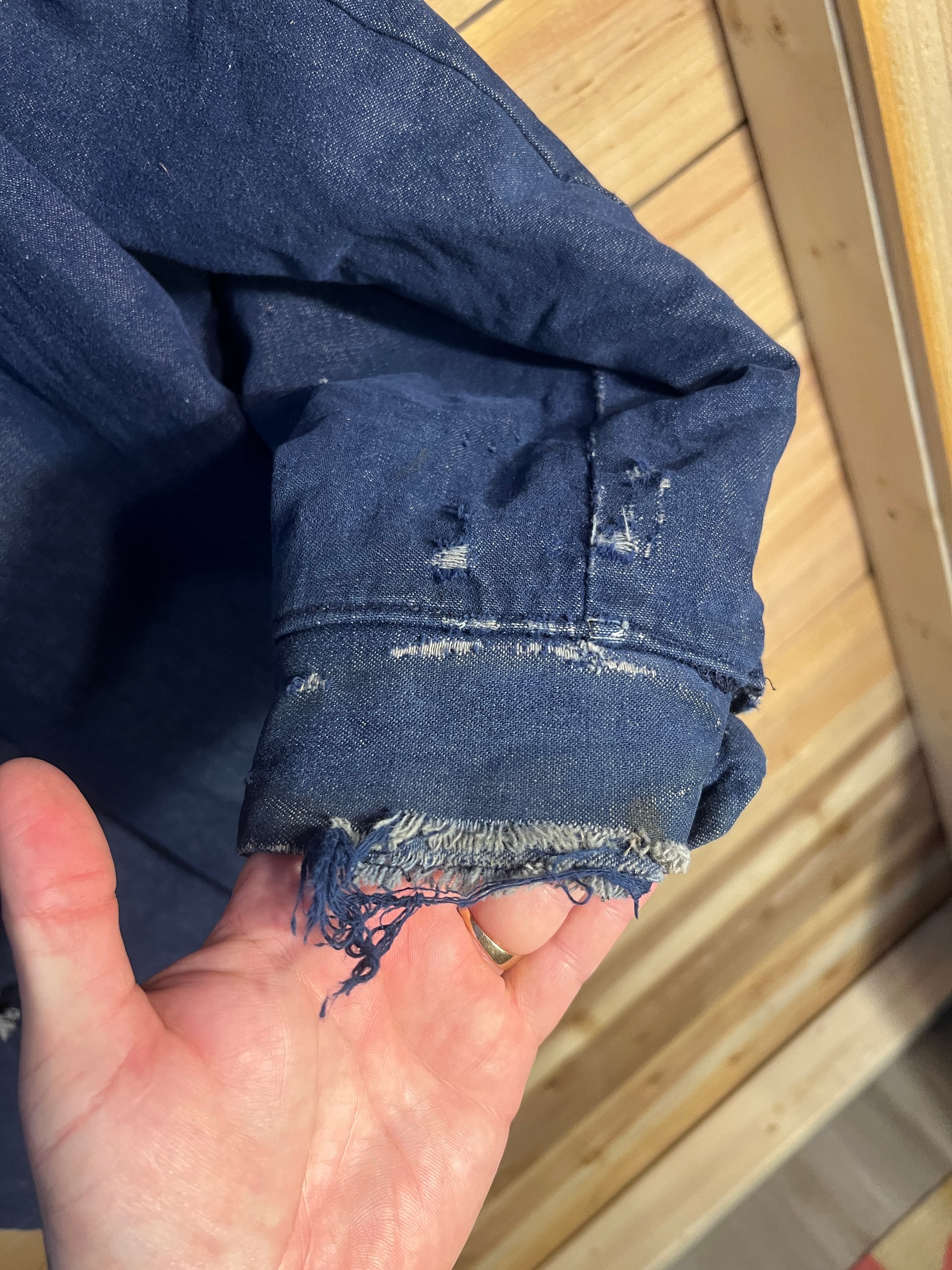 Size 46. Great distressing throughout. A tear in the back.